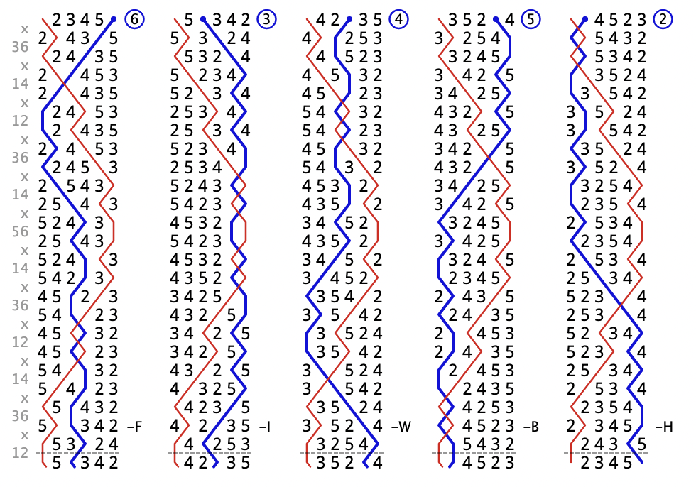 Look at the leadheads (the treble’s backstroke lead; the bit after the dashed line in each column). Here they are in order: 135264, 156342, 164523, 142635, and rounds. Now let’s look at the Cambridge leadheads:
